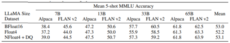 - 위 표는 LoRA-adapted 된 7B~65B 크기 LLaMA의 데이터 타입 별 5-shot MMLU 정확도이다. LLaMA의 경우 33B부터는 리소스 한계로 full-finetuning을 할 수 없어 애초에 LoRA로 비교했다고 한다. 두 instruction following 데이터셋을 각각 학습한 모델들을 5-shot MMLU task로 검증했는데, NF4 + DQ 조합의 LLaMA + QLoRA가 BF16 LLaMA + LoRA의 성능을 거의 완벽히 따라잡을 수 있다는 결과가 도출되었다. 반면 FP4 버전은 BF16 버전보다 평균적으로 1% 정도 성능 하락이 있음을 확인하였다