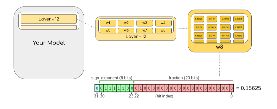 - 원본 가중치 데이터는 16비트 부동 소수점 값으로 저장됩니다.