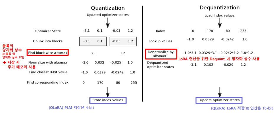 - 위의 NF4 양자화는 [-1, 1] 내로 구간을 정규화하는 과정이 포함된다. 그렇다는 말은, 입력 텐서의 absmax 값으로 나머지 값들을 나누는 과정이 필요하다는 뜻이다. 이때 사용되는 absmax가 바로 양자화 상수이다. QLoRA에서 PLM은 얼어있지만 LoRA는 업데이트가 필요하고, 이때의 LoRA 어댑터는 4비트가 아닌 16비트 실수형으로 존재한다. 때문에 4비트 모델과 16비트 어댑터 간 연산을 위해 quantization-dequantization을 반복해야 하므로, 이 양자화 상수는 모델 밖에 따로 저장되어야 한다.