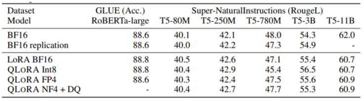 결론적으로 QLoRA 기법은 FP4 또는 INT4로 단순하게 양자화된 모델 성능을 능가하며, 16비트 LoRA 또는 풀 파인튜닝에 준하는 성능을 달성할 수 있다고 한다.
