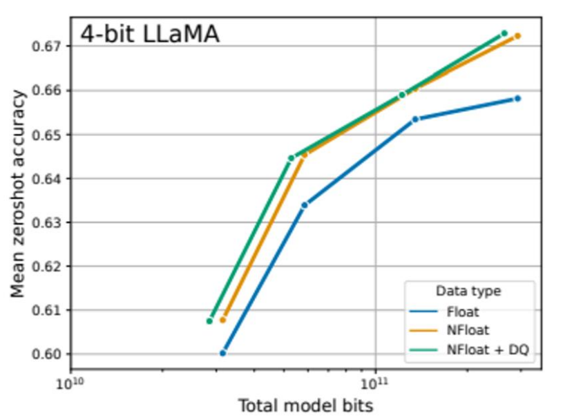 - 위 그래프는 여러 4비트 데이터 타입의 LLaMA가 수행한 벤치마크 결과이며, 두번째 표는 125M~65B의 O 4비트 모델들의 Pile-CC 데이터셋에 대한 perplexity이다. PPL은 '헷갈리는 정도로 낮을 수록 성능이 좋은것임. NF4의 성능이 FP4나 int4 데이터 타입들에 비해 유의미하게 높은 성능을 보이며, double quantization까지 추가되는 경우 성능 저하 없이 메모리 사용량의 감소를 구현할 수 있음을 확인할 수 있다.