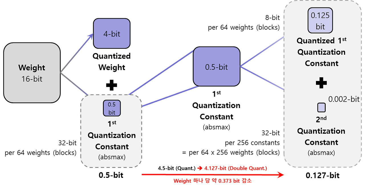 - 최종적으로, 이중 양자화(Double Quantization) 과정을 통해 16비트 가중치를 4.127비트로 줄입니다.