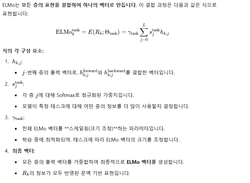 - ELMo는 양방향 모델(biLM)**이지만, 순방향과 역방향 모델이 별도로 학습되고, 최종적으로 출력이 결합됩니다. 따라서, 각각의 모델은 단방향이라고 말할 수 있습니다.